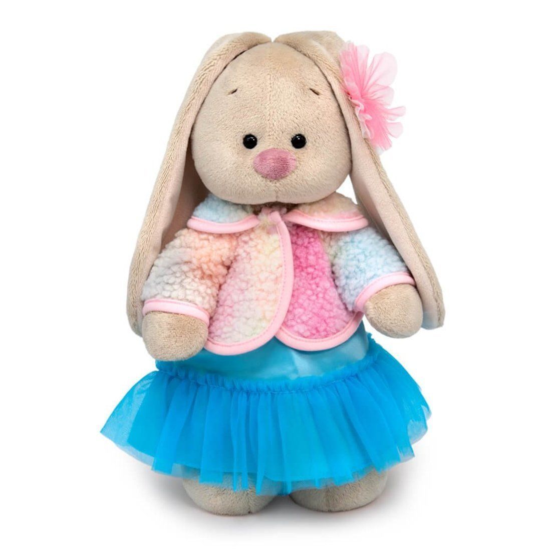 Зайка Ми в милом комплекте. Юбочка небесного цвета из крепа с пышной оборкой из сеточки. Курточка из буклированного меха в радужных оттенках с отделкой из розовой бейки. На ушке у Зайки цветок, выполненный вручную из сеточки цвета розовой карамели. Игрушка поставляется в коробке с окошком.