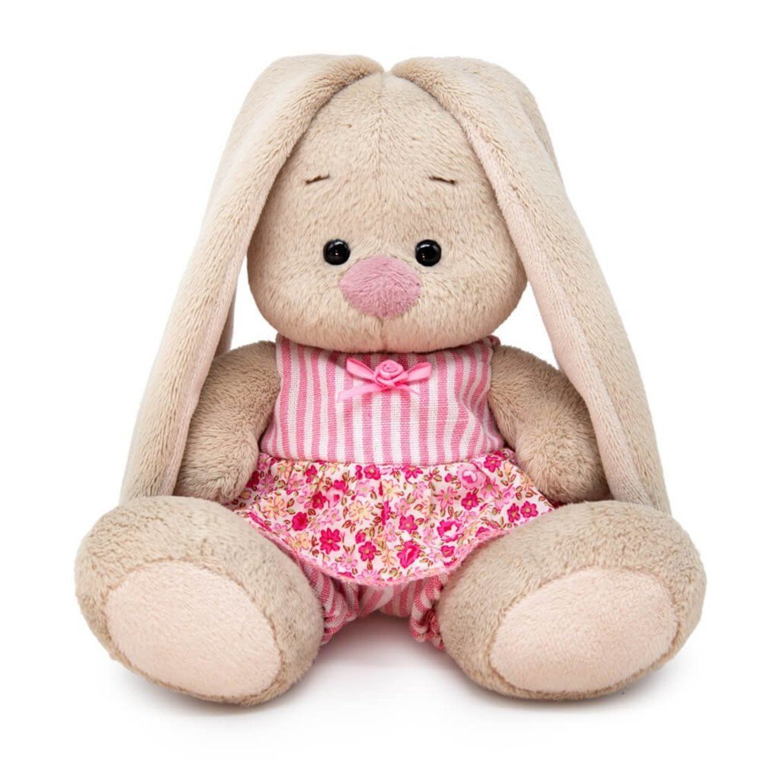 На малышке Зайке симпатичный полосатый комбинезончик из хлопковых тканей-компаньонов с оборкой из ткани в цветочек. Спереди комбинезон украшен атласным бантиком с розочкой. Игрушка поставляется в открытой коробке.