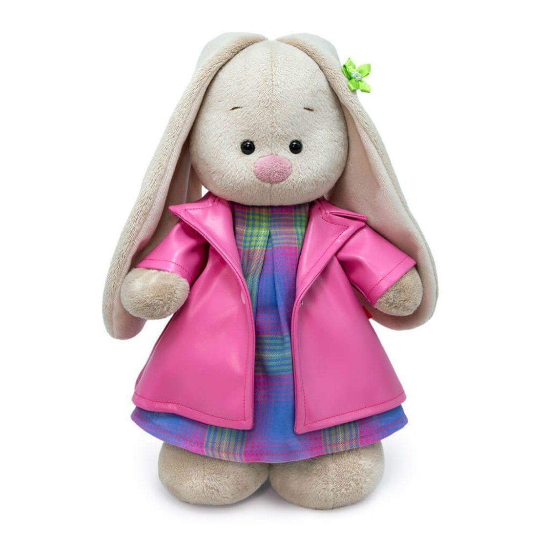 Очень стильный комплект на Зайке. Длинное пальто из модной в этом сезоне экокожи цвета розовой гвоздики и платье в сиреневых тонах из рубашечной ткани в крупную клетку. На ушке атласный цветочек цвета лайма с жемчужными бусинами в серединке. Игрушка поставляется в оригинальной подарочной упаковке.