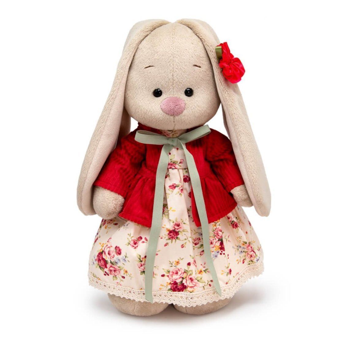 Зайка в милом комплекте в стиле шебби‑шик. Х/б платье молочного цвета с набивным рисунком и домотканым кружевом по подолу. Спереди платье украшает бант из ленты цвета полыни. В комплекте жакет с баской, без воротника и с длинным рукавом. Жакет сшит из мягкого шелковистого вельвета красного цвета Рококо. На ушке у Зайки атласный цветок в тон жакета. Игрушка поставляется в подарочной упаковке.