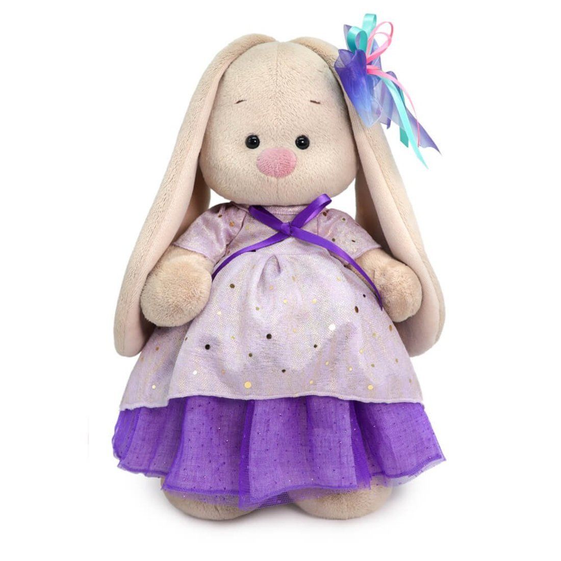 Зайка Ми в нарядном платье из сиреневого трикотажа с золотистым блеском и золотыми пайетками. Нижняя юбка выполнена из фиолетовой марлевки и сеточки с блеском. Спереди платье украшает бантик из атласной фиолетовой ленты. На ушке у Зайки ручной работы составной бант из цветных лент. Игрушка поставляется в подарочной упаковке.
