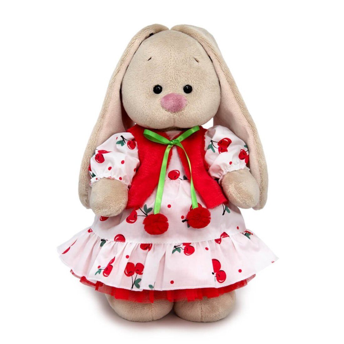 На Зайке яркое платье с жилетиком в бело‑алых тонах. Платье с вишнями сшито с пышным рукавчиком, с оборкой по низу и нижней юбкой из сеточки. Невероятно мягкий жилет сшит из короткого меха с завязкой на салатовую атласную ленту с красными помпонами на концах.