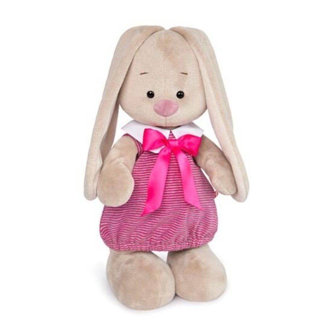 Зайка Ми - это мягконабивная игрушка, которая может стать идеей для трогательного и запоминающегося подарка девочке. На Зайке Ми летнее платье без рукавов из х/б трикотажа в тонкую серо-розовую полоску. Платье по подолу присобрано на широкую резинку и украшено белым круглым воротничком. Спереди платье украшает атласный бант из широкой ленты цвета фуксии. Игрушка поставляется в подарочной коробке.