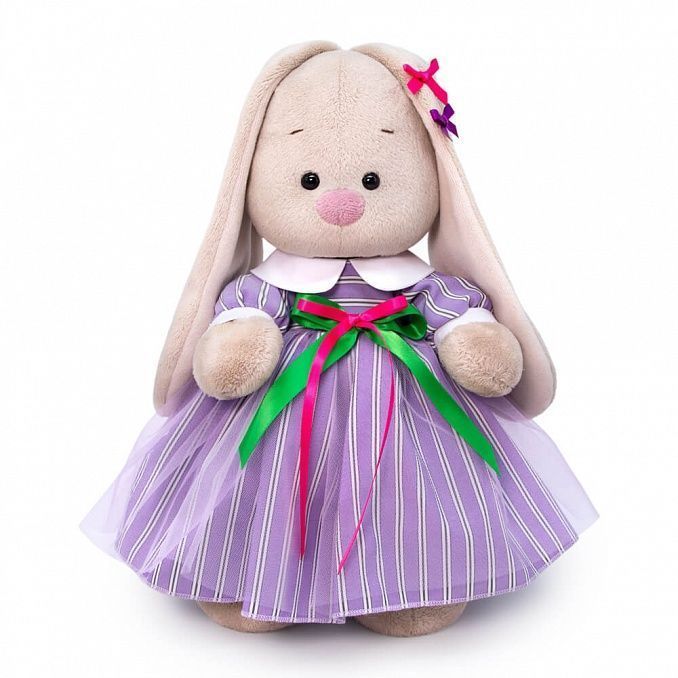 Зайка Ми - это мягконабивная игрушка, которая может стать идеей для трогательного и запоминающегося подарка девочке. У Ми настолько милый образ, что в неё сложно не влюбиться с первого взгляда! На Зайке очаровательное платье в сиреневых тонах. Спереди платье украшено бантом из атласных лент. На ушке Зайки украшение — два ярких атласных бантика. Игрушка поставляется в подарочной коробке.