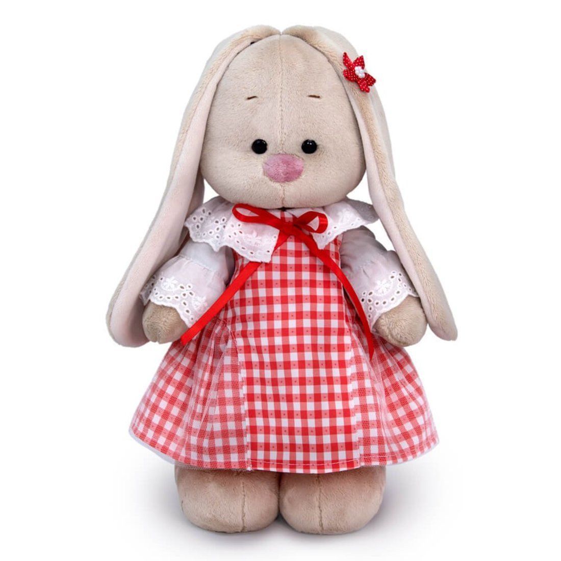 Зайка Ми в очаровательном комплекте. Сарафан сложного кроя из рубашечной ткани в красно‑белую клеточку и белой сеточки. Спереди на сарафане атласный алый бантик. В комплекте также белоснежная хлопковая блузка, расшитая шитьем. На ушке у Зайки красный цветочек с серединкой из маленьких жемчужин. Товар поставляется в подарочной упаковке. Высота игрушки: 32 см. Изделие изготовлено из искусственного меха с элементами пластмассы и текстильных материалов. Рекомендованный возраст: 3 года +