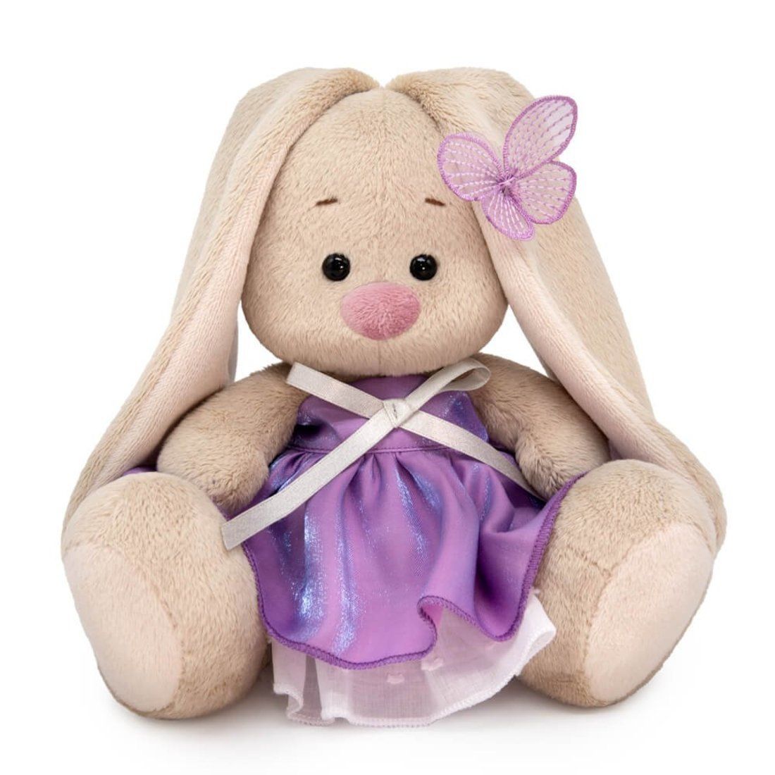 Малышка Зайка в милом сиреневом сарафанчике из тонкой переливающейся ткани. Нижняя юбочка сшита из белоснежной х/б ткани с выработкой. Спереди сарафанчик украшен серебристым бантиком. На ушке у малышки нежнейшая бабочка из сиреневой органзы с вышивкой.