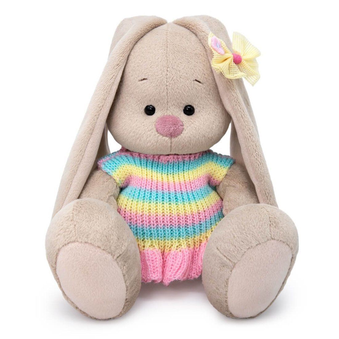 Зайка в вязаном платье из мягкого акрила в радужных оттенках. На ушке составной аксессуар, собранный из желтого бантика из сеточки и розового вышитого цветочка. Игрушка поставляется в открытой коробке.