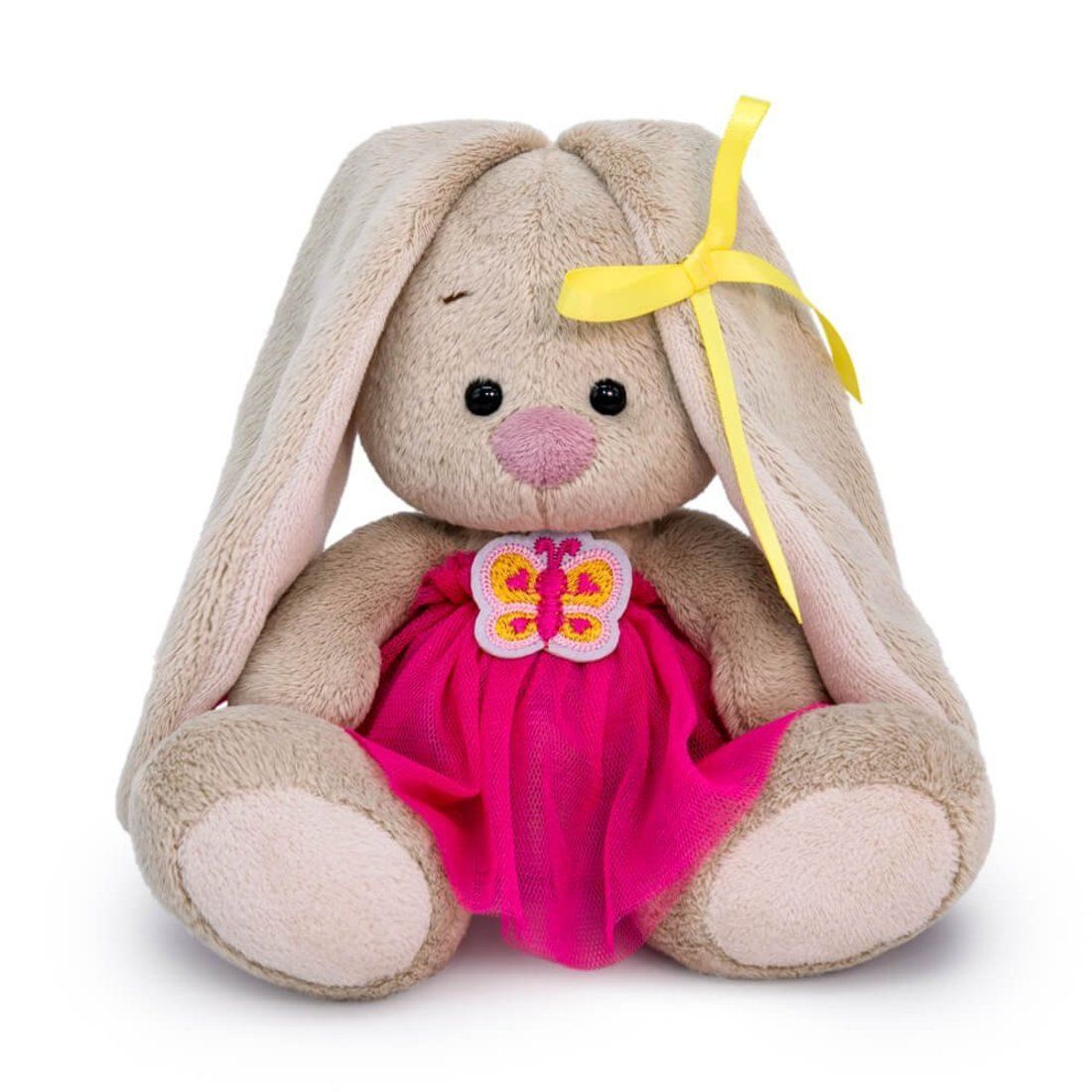 Малышка Зайка в миленьком сарафанчике из сеточки цвета мадженты. Спереди сарафанчик украшен нашивкой в виде забавной бабочки. На ушке у Зайки атласный бантик цвета яичного желтка. Игрушка поставляется в открытой коробке.