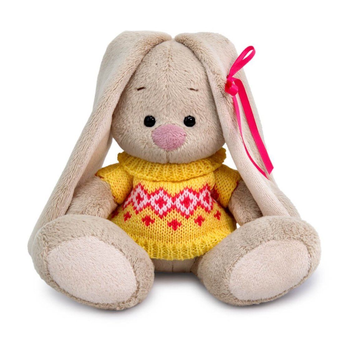 На малышке Зайке Ми шикарный вязанный жилет со спущенным рукавчиком. Жилет из нежного акрила цвета мимозы с ромбовидным орнаментом спереди. На ушке у Зайки атласный бантик цвета розового пиона.Игрушка поставляется в открытой коробке.