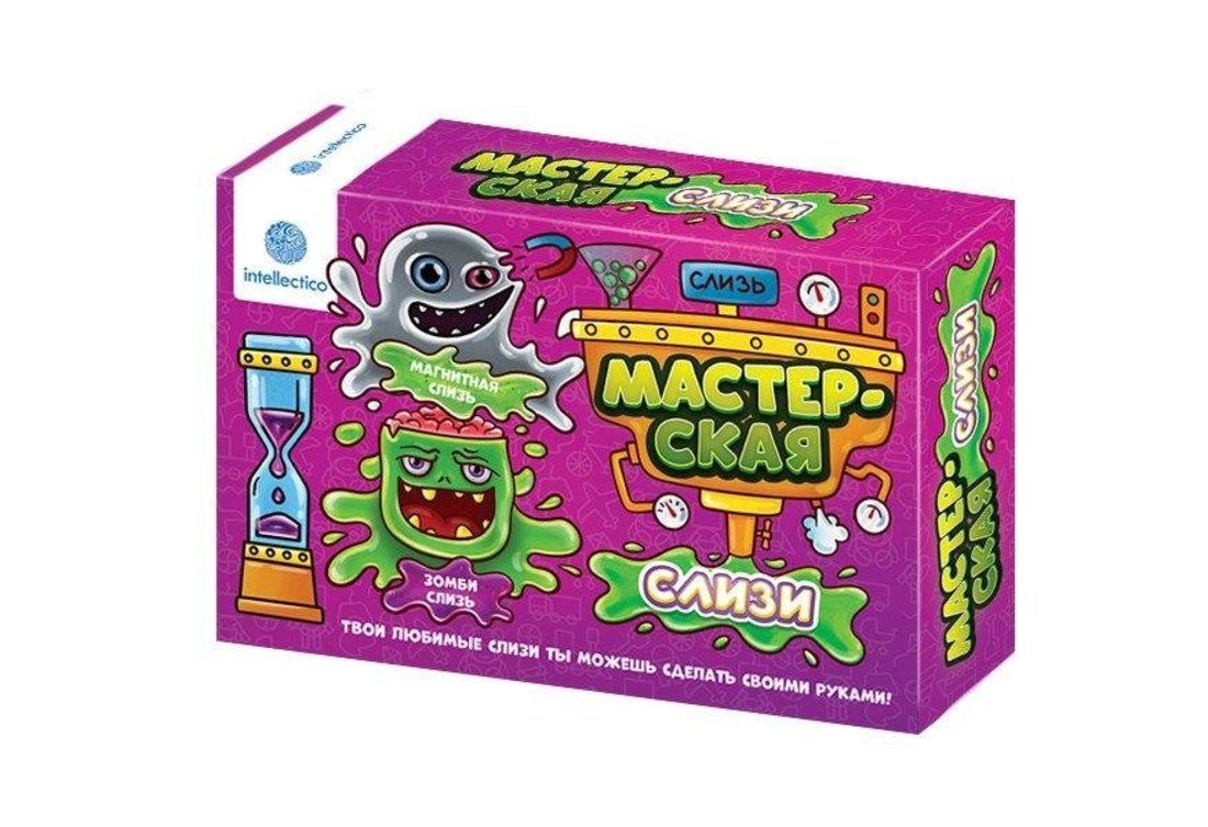 Набор для опытов «Мастерская слизи» позволит сделать две слизи своими руками! Зомби-слизь -- светящаяся в темноте слизь с флуоресцентным красителем кислотно-зелёного цвета. Магнитная слизь -- слизь с алюминиевым пигментом и железным порошком насыщенного металлического цвета. Тянется за магнитом и проглатывает его!