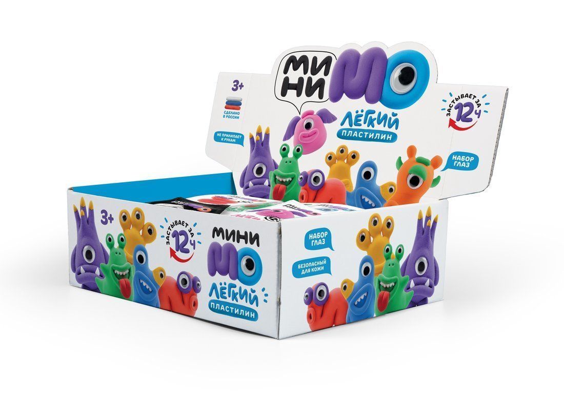 Легкий пластилин ТМ МиниМо с набором глазок. Застывает на воздухе в фигурку за 12* часов. Супер мягкий и легкий, приятный на ощупь Нет необходимости разминать массу перед лепкой. Отлично держит любую форму. Из него можно лепить практически что угодно, как из обычного пластилина, но легко даже маленькому ребенку. Не липнет и не остается на руках. Безопасный для кожи. Имеет приятный фруктовый аромат. В шоу боксе 8 цветов (по 3 шт. каждого).