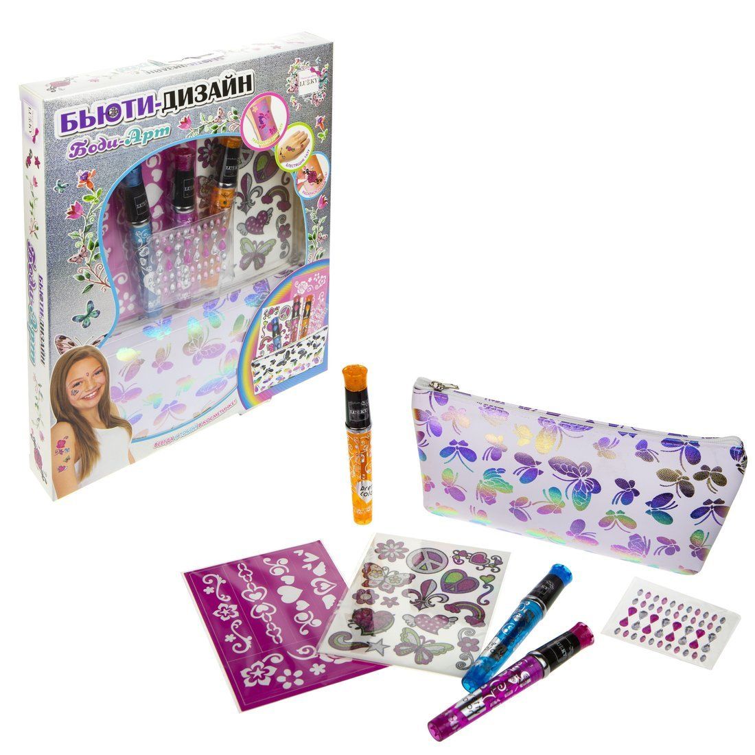Набор LUKKY Бьюти-Дизайн "Боди-Арт" - крутой набор для тех, кто любит татушки. Хотя, кто их не любит! Набор включает: 3 тату-ручки с блёстками (цвета: изумрудный, малиновый, оранжевый), трафареты для тату, тату-наклейками и самоклеящиеся стразы. В набор также входит инструкция. Используйте трафареты, чтобы нарисовать рисунки. Не ограничивайте свою фантазию трафаретами, ведь можно дополнять рисунки своим собственным творчеством, рисовать всё, что угодно, делать композиции из рисунков, а блестящие ручки в этом помогут. Не забудьте добавить стразы! Тату остаются на коже от 3 до 7 дней. Рисунки смываются лосьоном для тела. Достаточно оставить его на коже на 10 минут, затем смыть тёплой водой.