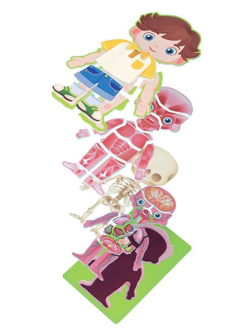 Скелет, органы, мышцы и кровеносная система собираются на разных уровнях, образуя единый механизм. В состав игрового набора входят: подложка-основание, 35 картонных пазлов, 6 пластиковых пазлов, а также обучающая брошюра с подписями.