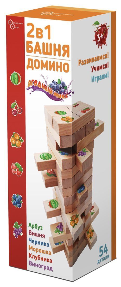 Во-первых, «Башня» очень хорошо развивает мелкую моторику, то есть активизирует участки мозга, отвечающие за сенсорику и мышление. Известно, что подобные игры способствуют профилактике различных сердечно-сосудистых заболеваний в старости и существенно ускоряют интеллектуальное развитие ребенка. Во-вторых, «Башня» учит пространственному и архитектурному мышлению: представить, какой брусок менее нагружен, чтобы вытащить его — задача достаточно сложная, но очень нужная ребенку. В-третьих, игра "Башня" развивает командный дух: дети могут играть в нее вместе и улучшать свои навыки коммуникации. В-четвертых, «Башня» очень хороша в качестве семейной игры: ведь в нее интересно играть и детям, и взрослым. На 28 брусках нанесены рисунки 6 видов ягод для игры в классический вариант "Домино". Количество ягодок на грозди соответствует цифре от 1 до 6.