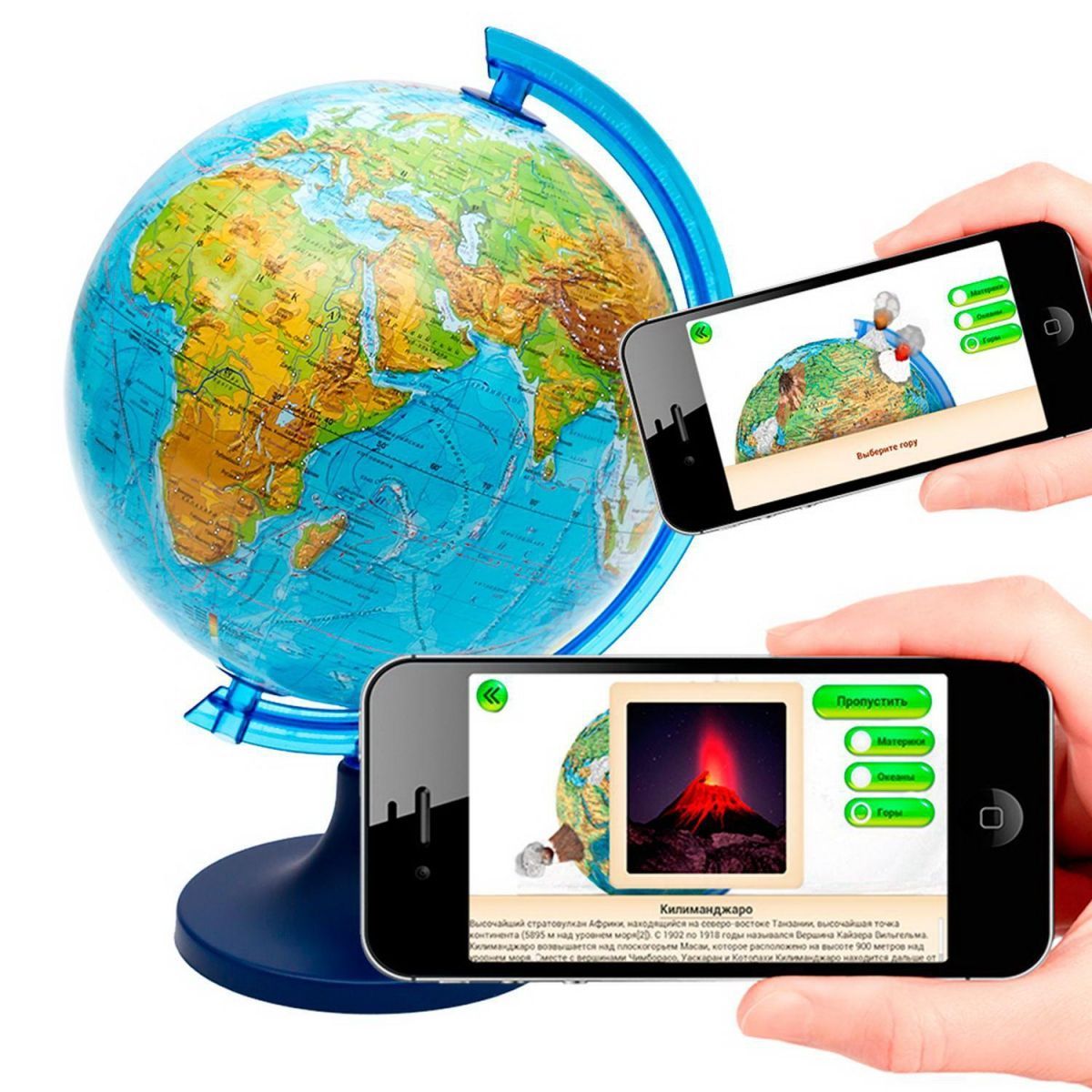 Интерактивный физический глобус ДИЭМБИ. AR. Альтернативная реальность. Дополненная реальность. 11 см. Мы предлагаем Вам отправиться в увлекательное путешествие по нашей планете с известными персонажами Сашей и Машей. Наши герои будут сопровождать Вас на протяжении всего приключения. Саша и Маша расскажут Вам о материках и океанах нашей планеты. Вы сможете узнать много интересного о действующих и давно потухших вулканах нашей планеты, вулканы представлены в виде 3D моделей, с которыми можно взаимодействовать и получать еще больше информации. В приложении предлагается раздел "Викторина", который поможет детям лучше запомнить полученную информацию. Глобус выполнен по классической технологии имеет надежную оснастку. Глобус упакован в картонную транспортировочную коробочку. Не является учебным пособием. Правообладатель не гарантирует работу программы на всех моделях мобильных устройств. Это маленький глобус для самых маленьких, но уже очень любознательных!