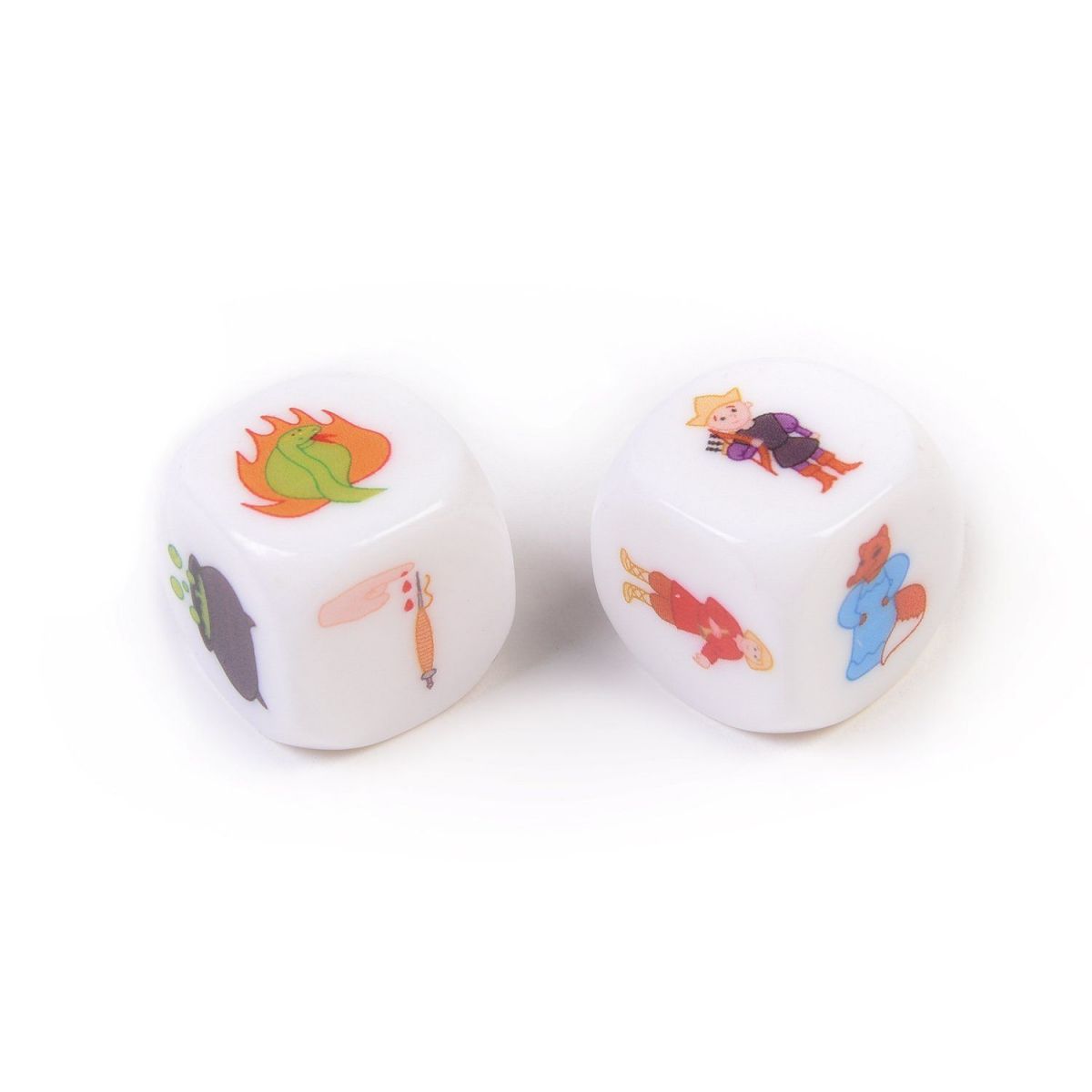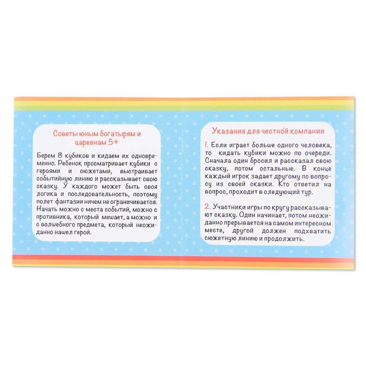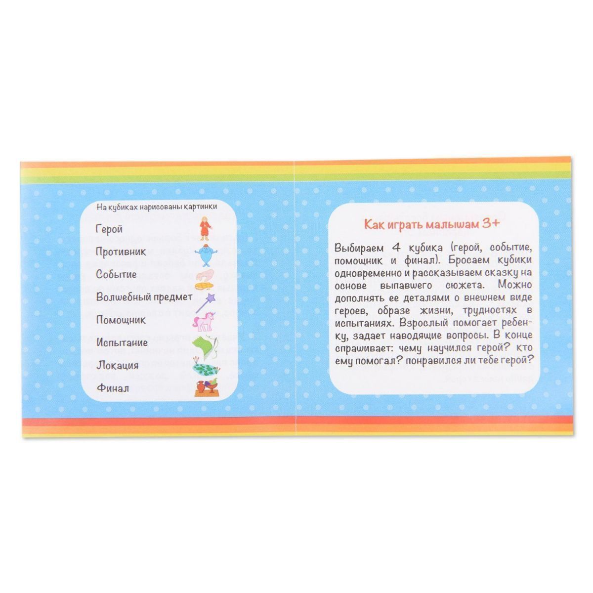Во всех вариантах каждый игрок в свою очередь кидает кубики и, опираясь на выпавшие изображения, выстраивает сюжетную линию новой сказки. На кубики нанесены 48 картинок, которые позволяют рассказать миллион сказок, не похожих друг на друга. Сказку разрешается дополнять деталями о внешнем виде героев или об их образе жизни. Если детям будет сложно рассказывать историю, тогда взрослые могут задавать различные наводящие вопросы, которые подскажут ребятишкам необычный поворот сюжета.