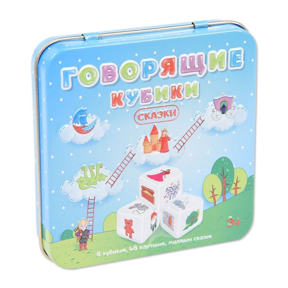 Настольная игра в жестяной коробочке «Говорящие кубики Сказки» способствует развитию речи, фантазии, воображения, логического мышления, обучает навыку последовательно рассказывать свою историю, а также видеть причинно-следственные связи.