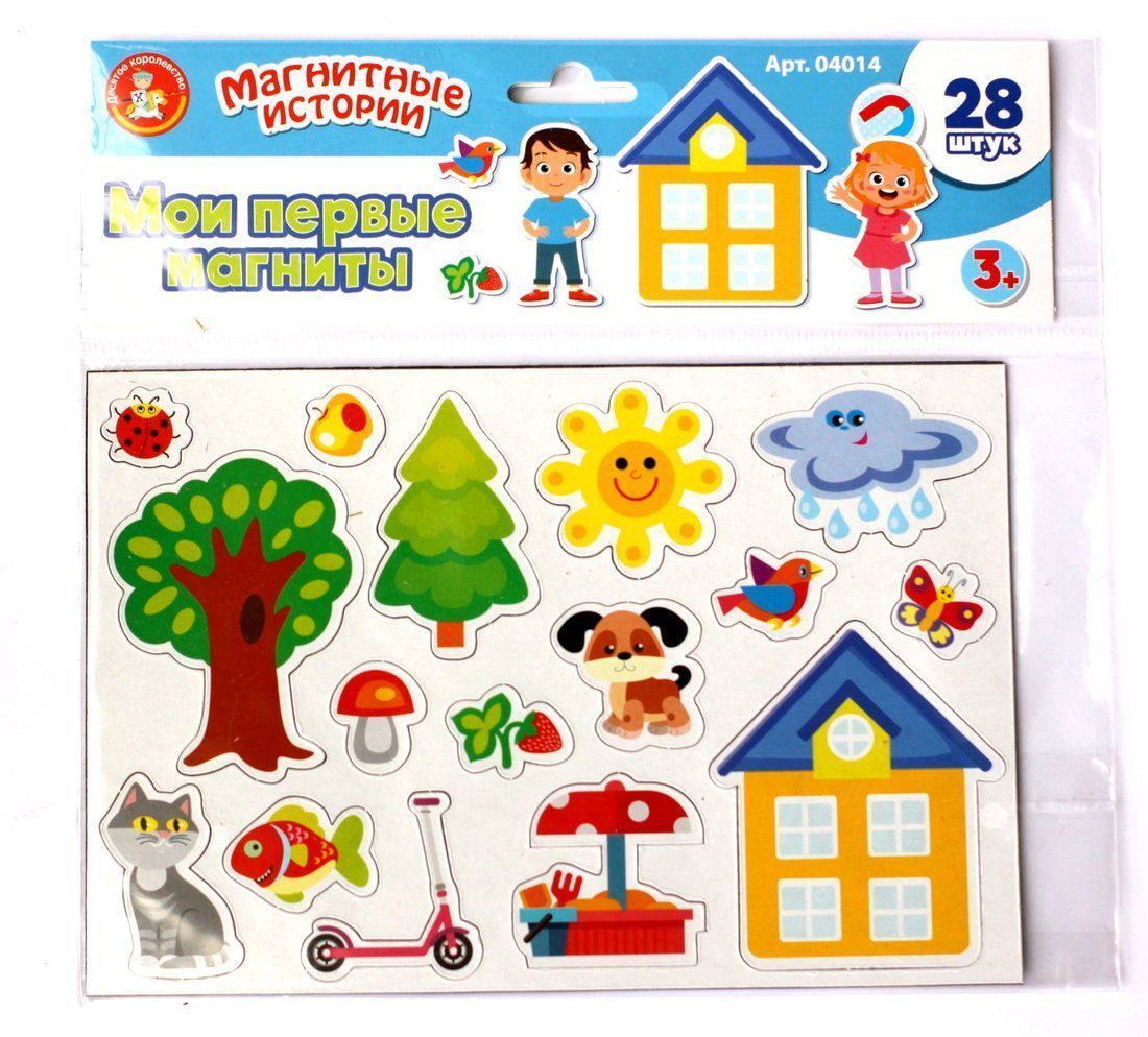 Игра Мои первые магниты содержит 28 элементов. Предназначена для детей от 3-х до 5-и лет.