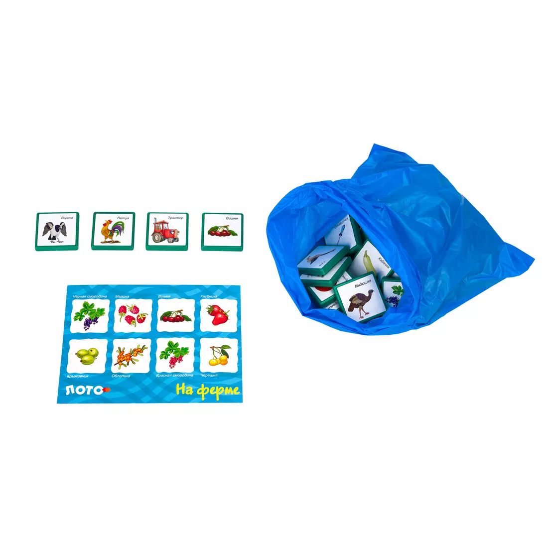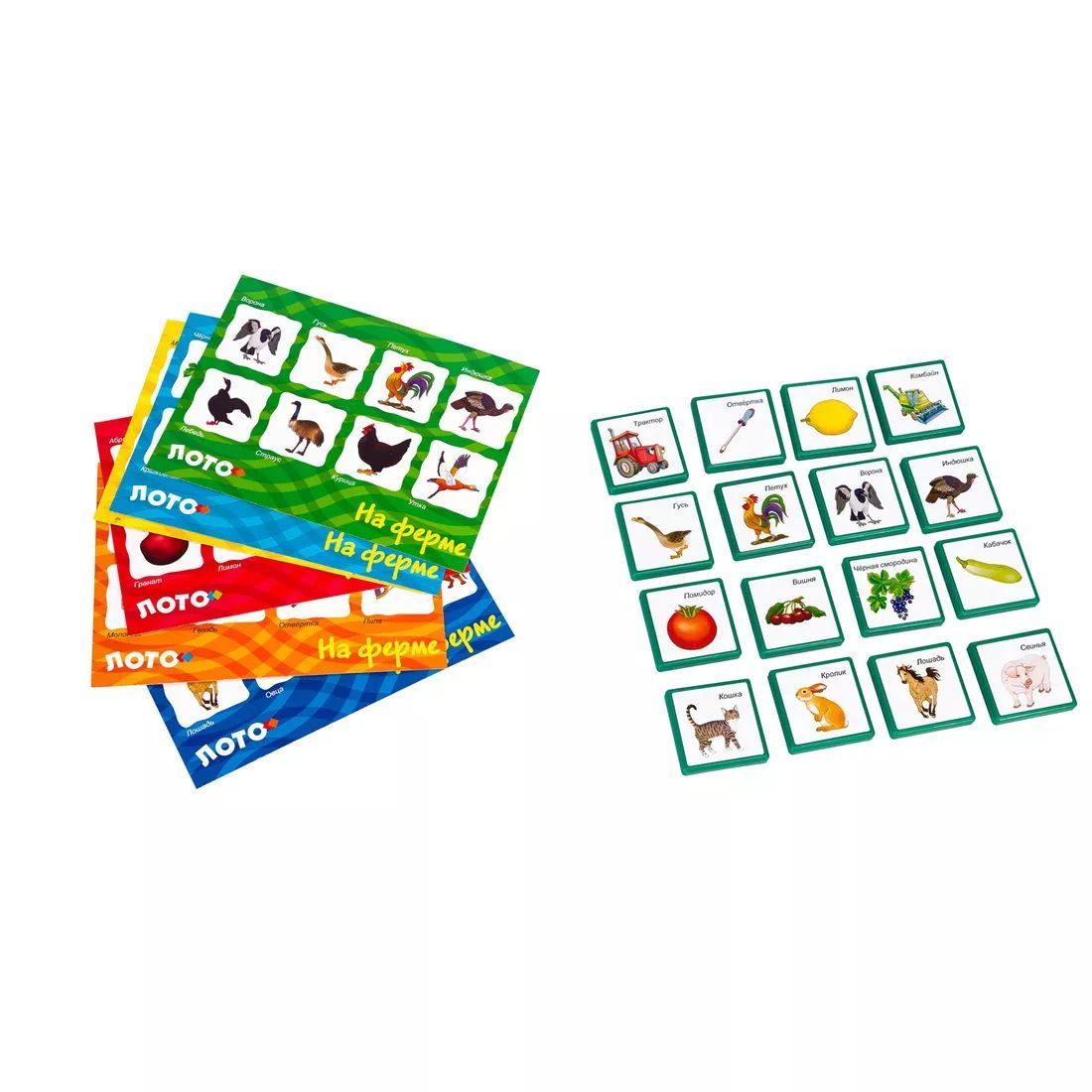 Лото «На ферме» знакомит с разными животными, которых ребёнок может увидеть в деревне. Правила игры схожи с классическим лото, но вместо бочонков с цифрами в комплект входят карточки с картинками. Что полезного в игре? Игра позволяет моделировать различные игровые ситуации. В процессе игры развивается логическое мышление, наблюдательность, внимание, память, мелкая моторика. Состав игры: - карточки (6 шт.); - фишки (48 шт.); - пакет для хранения (1 шт.); - правила игры (1 шт.). Количество игроков. В игре может принимать участие от 2 до 6 участников. Возраст игроков. Игра подходит для детей от 3 лет.