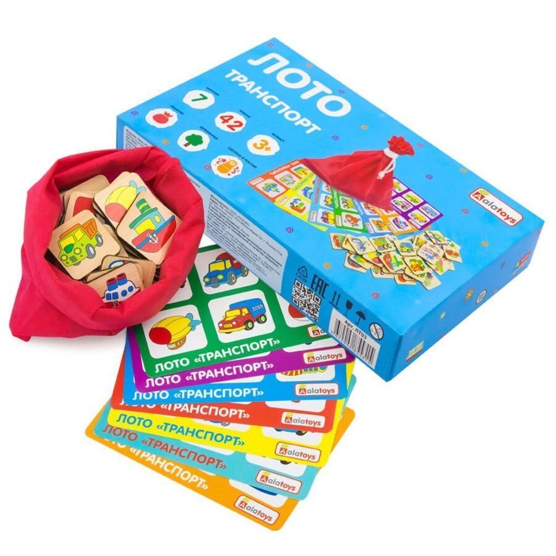 В комплекте: 42 фишки, 7 карточек, мешочек.