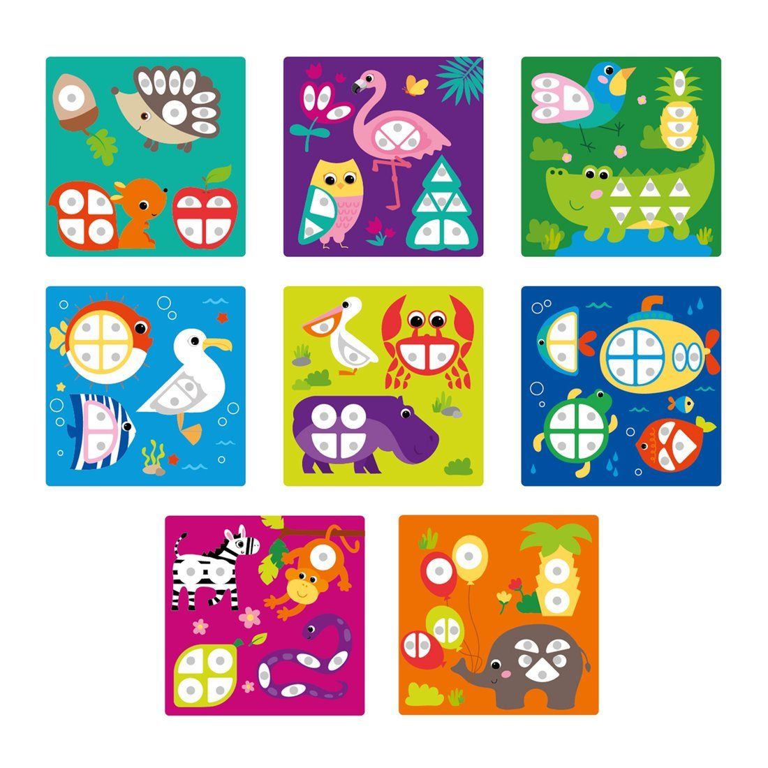Набор включает пластиковую основу размером (ДхШ) 24х24 см, 85 деталей безопасного для малышей размера, 8 карточек с 28-ю заданиями и мешочек для хранения.