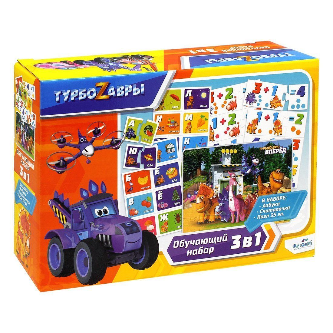 Обучающий набор 3 в 1 создан для эффективных занятий с ребенком. Внутри красивой подарочной коробки, выполненной в дизайне Турбозавров, ребёнок найдёт азбуку из 64-х пазловых элементов, считалочку из 16-ти примеров и пазл из 35-ти элементов размером 33х46 см.