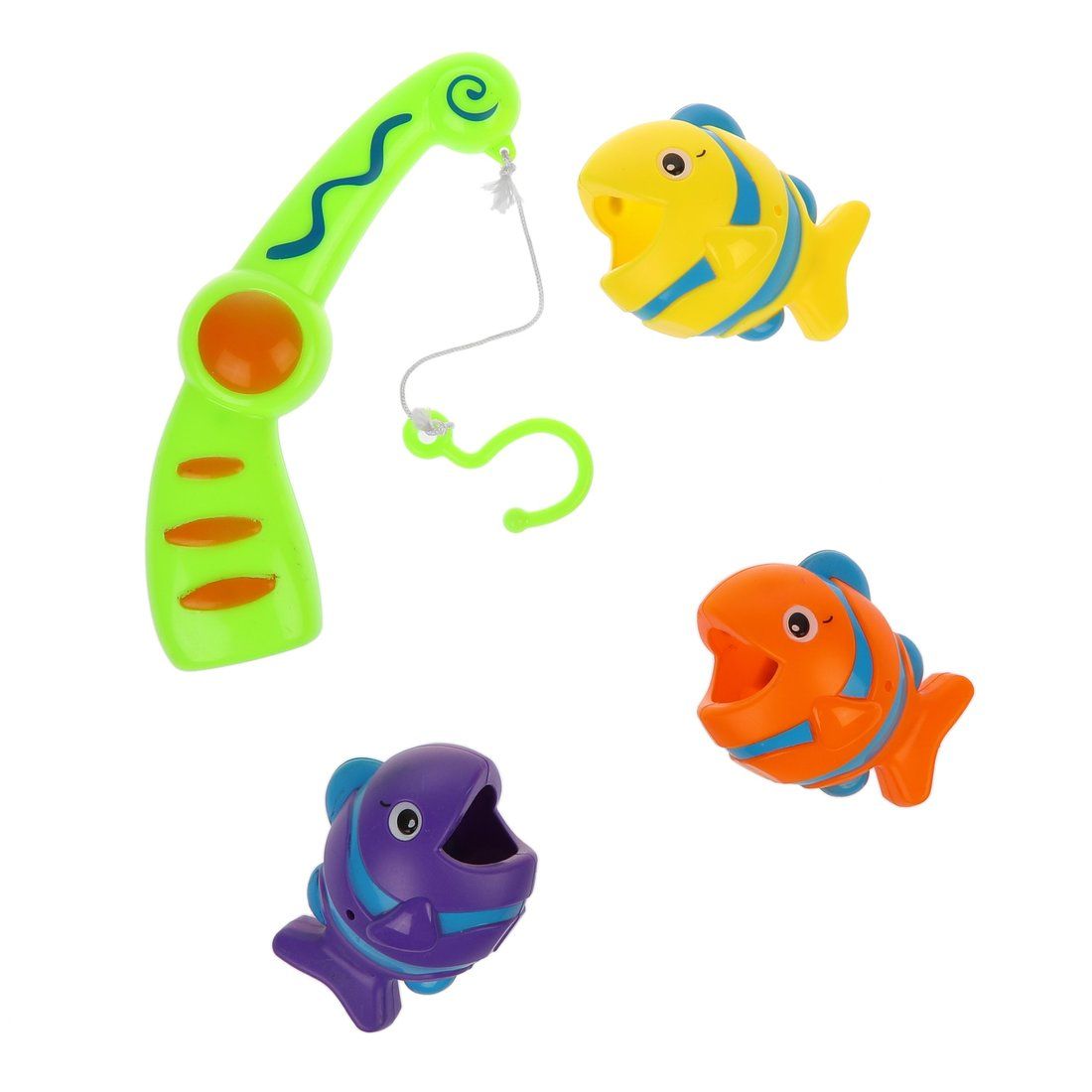 входят: удочка с крючком и 3 красочных фигурки рыбок, которых малышу предстоит