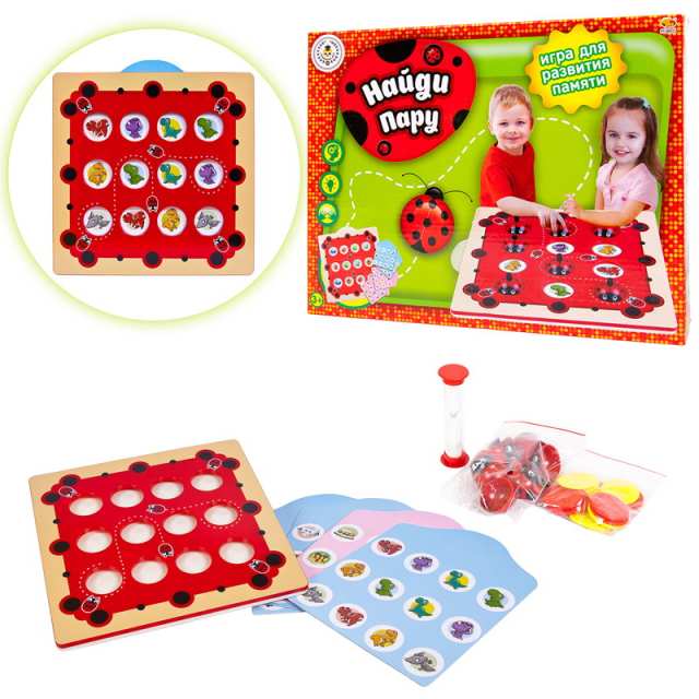 Комплектация: игровая доска, двусторонние карточки 4 шт., жучки 12 шт., желтые фишки 8 шт., красные фишки 8 шт., песочные часы.