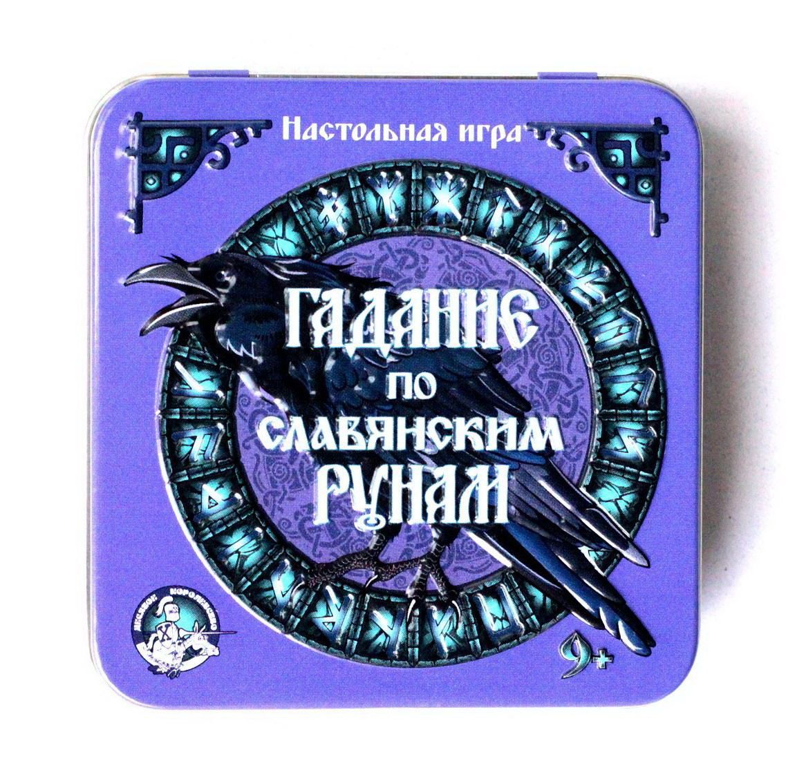 Настольная игра «Гадание по славянским рунам» в жестяной коробочке (серия «Игры в табакерке»). Состав: руны – 18 шт. (диаметр – 2,5 см), мешочек из ткани (17,5 х 12 см), правила игры. Материал: дерево, текстиль, бумага. Для детей от 9 лет. Игра даёт ответы на волнующие вопросы, развивает внимание и концентрацию, знакомит с древним миром славянской символики.
