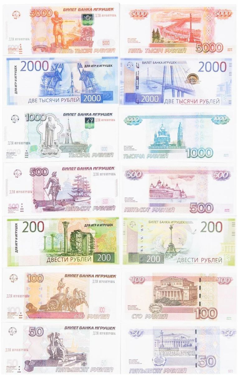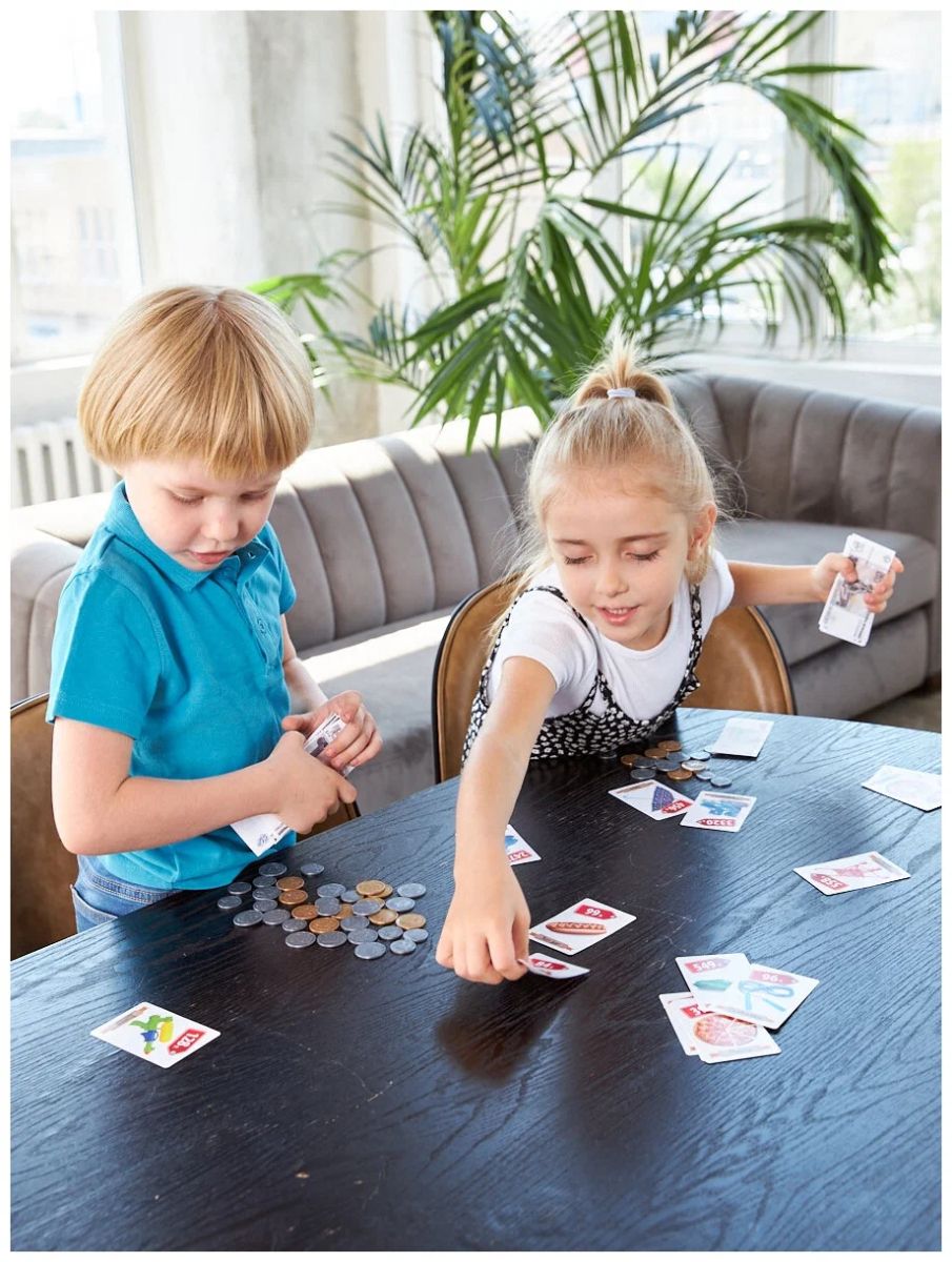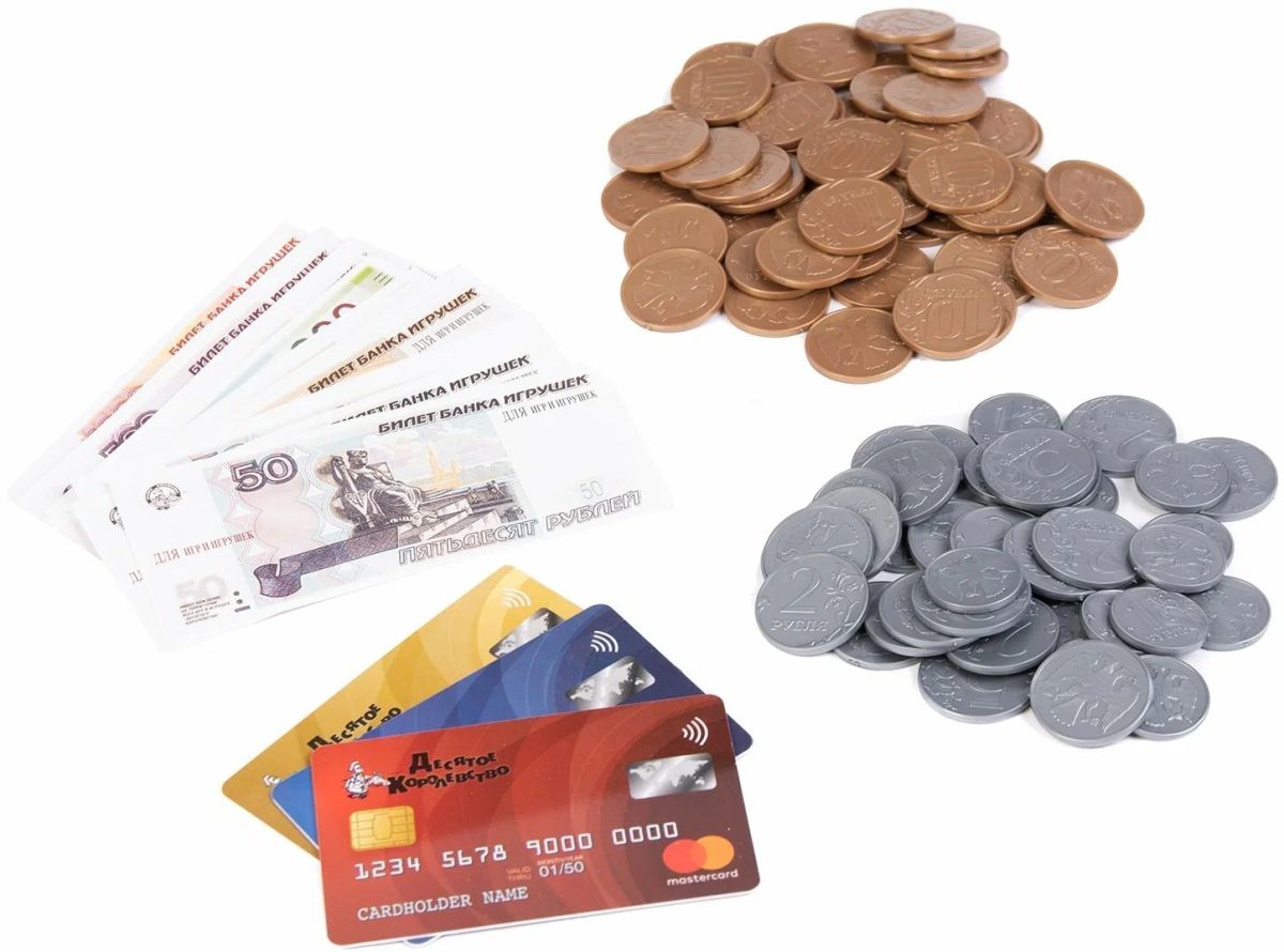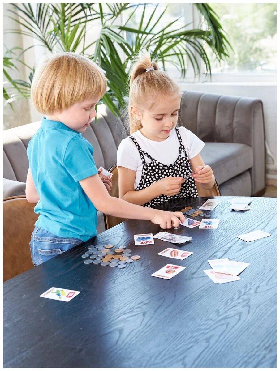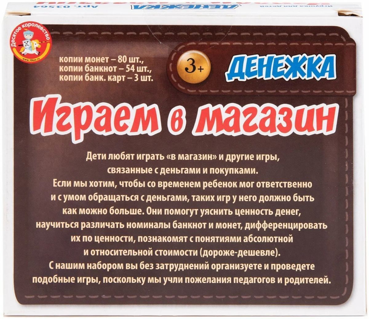 Игра настольная «Играем в магазин. Денежка» (серия «Счётный материал»). Состав: копии монет (1, 2, 5, 10 руб.) – 80 шт. (1 рубль: диаметр – 1,8 см, толщина – 1 мм; 2 рубля: диаметр – 2,3 см, толщина – 1,5 мм; 5 рублей: диаметр – 2,3 см, толщина – 1,5 мм; 10 рублей: диаметр – 2,2 см, толщина – 2 мм), копии банкнот (50, 100, 200, 500, 1000, 2000, 5000 руб.) – 54 шт. (11,5 х 5 см), копии банковских карт – 3 шт. (8,4 х 5,7 см). Материал: пластмасса, бумага. Рекомендовано для детей от 3 лет. Игра развивает финансовую грамотность, фантазию, коммуникативность, поможет детям уяснить ценность денег, научиться различать номиналы банкнот и монет, дифференцировать их по ценности, познакомит с понятиями абсолютнои^ и относительнои^ стоимости (дороже–дешевле).