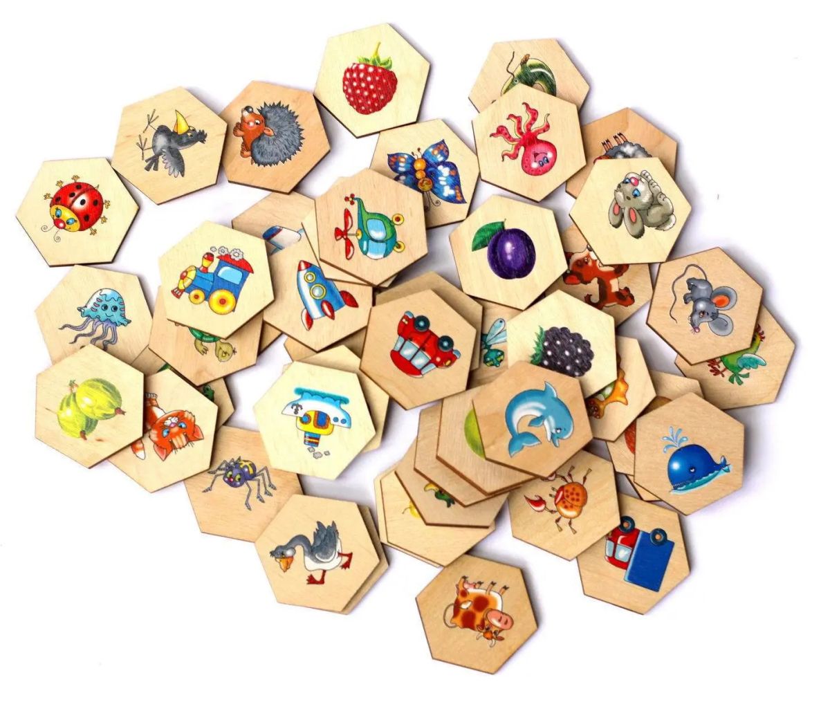Лото деревянное «Пчёлка» (серия «Учись, играя!»). Состав: картонные карточки – 6 шт. (20,5 х 12,5 см), деревянные фишки – 48 шт. (4,2 х 4,8 см), мешочек из ткани. Материал: фанера (березовая), картон, ткань. Для детей от 3 лет. Развивает внимательность, скорость реагирования, визуальную и слуховую память, навыки обобщения, речь и кругозор.