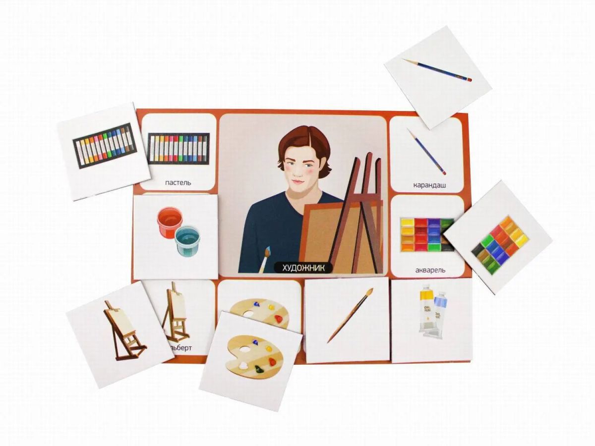 - 6 больших карточек размером 15х11 см. На них изображены картинки с представителями профессий и предметами, которые к ним относятся - «Военный», «Повар», «Врач», «Парикмахер», «Художник», «Фермер»;