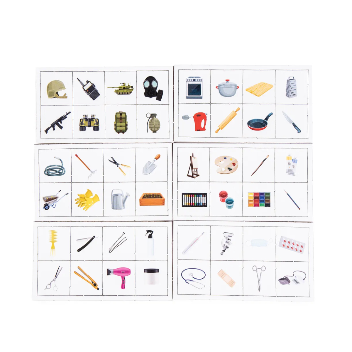 - 6 больших карточек размером 15х11 см. На них изображены картинки с представителями профессий и предметами, которые к ним относятся - «Военный», «Повар», «Врач», «Парикмахер», «Художник», «Фермер»;