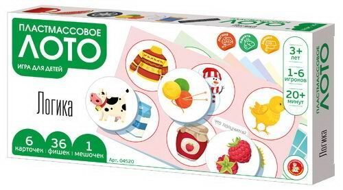 Лото пластмассовое "Логика". Состав игры: 6 карточек 14,5х9 см, 36 пластиковых фишек (диаметр - 4 см), мешочек. Матералы: картон, текстиль, полимерные матералы. Для детей старше 3 лет.