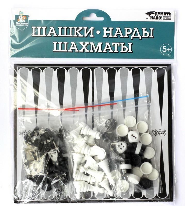 Компактный набор классических игр «Шашки, нарды, шахматы 3в1» (серия «Думать надо!»). Состав игры: двустороннее игровое поле из картона – 1 шт. (толщина – 1 мм, 21,7 х 18,5 см), шашки пластиковые – 30 шт. (высота – 4 мм, диаметр – 1,4 см), шахматы пластиковые – 32 шт. (высота – до 3,5 см, диаметр – 1,3 см), кубики игральные (белые) – 2 шт. (1,5 х 1,5 см), правила игры. Материалы: пластмасса, картон, бумага. Для детей от 5 лет. Игры развивают образное мышление, комбинаторику, память, внимательность, логическое мышление.