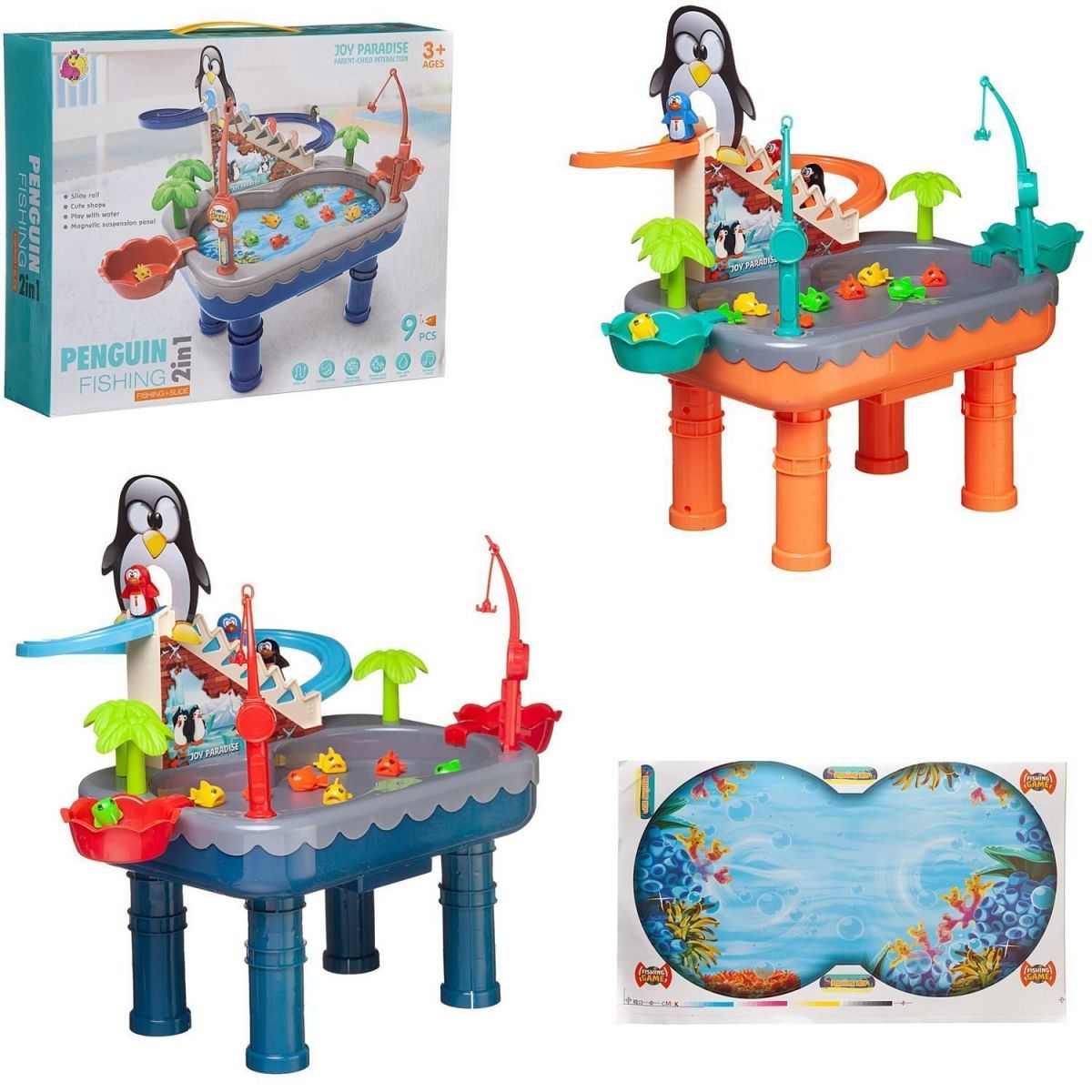 Комплектность: игровое поле – 1 шт., комплект стикеров для игрового поля – 1 шт., лестница – 1 шт., пингвин – 3 шт., горка – 1 шт., ножка для стола – 4 шт., аквариум круглый – 2 шт., листва – 3 шт., ствол дерева – 3 шт., удочка – 2 шт., картонная арка в виде пингвина – 1 шт., рыбка – 9 шт.