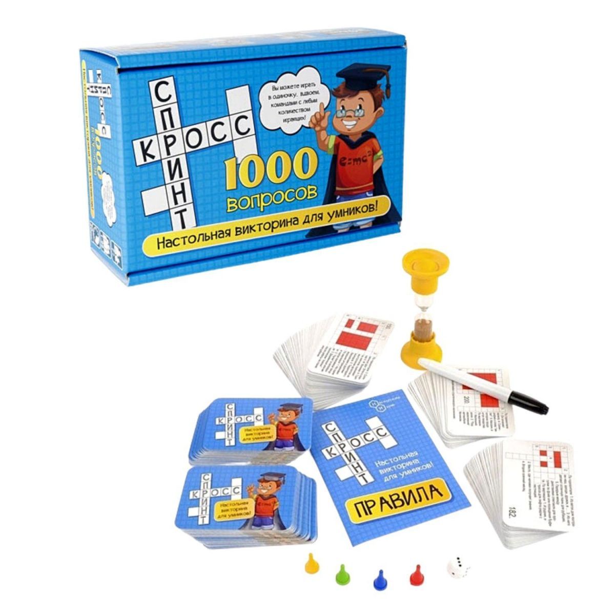 (всего 1000 вопросов), 16 специальных карточек, фломастер, тряпочку, песочные