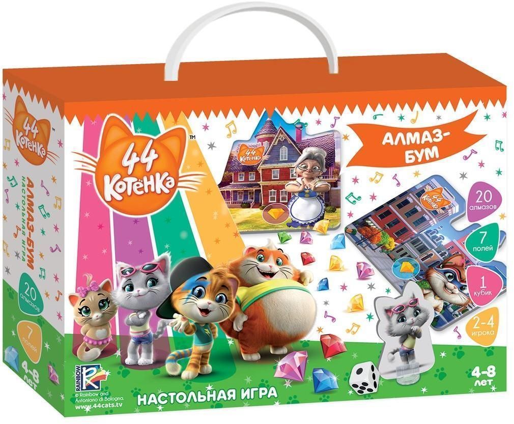 Присоединяйтесь к команде пушистых котят и отправляйтесь навстречу новым приключениям! Интересные локации, неожиданные повороты, настоящий алмазный бум и множество других интересностей уже ждут вас. В ходе игры вам предстоит передвигаться по игровым полям и собирать алмазы. Подбрасываем по очереди кубик и движемся вперёд. Победит тот, кто соберёт больше всех драгоценностей. Настольная игра гарантированно поднимет настроение и потренирует воображение, логическое мышление, речь и коммуникативные навыки.