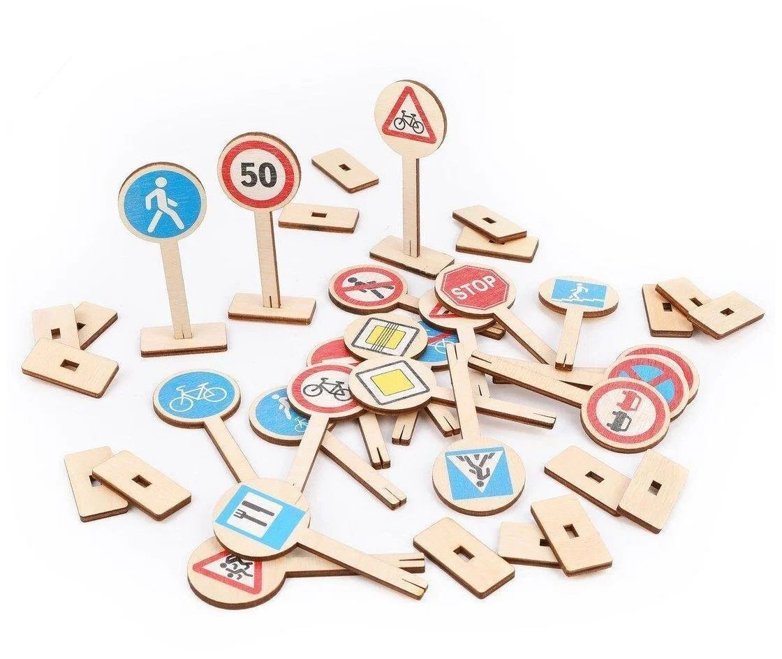 Игра состоит из стоек и подставок к ним. На лицевой стороне стоек изображены дорожные знаки. Ребёнок может самостоятельно или при помощи взрослых собрать дорожные знаки. Игру «Деревянные дорожные знаки» можно использовать в сочетании с другими играми по теме правил дорожного движения.