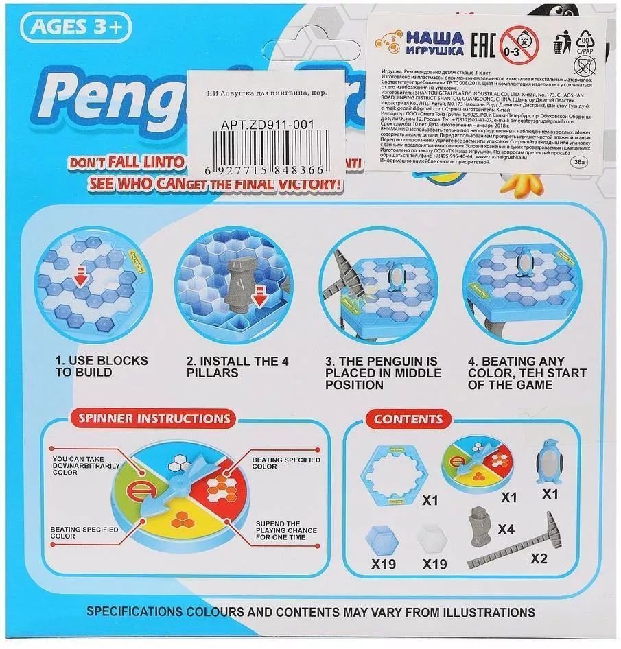 Состав игрового набора: поле-основа, 4 ножки, 19 белых льдинок, 19 синих льдинок, 2 молоточка, 1 фигурка пингвина, 1 рулетка со стрелочкой.