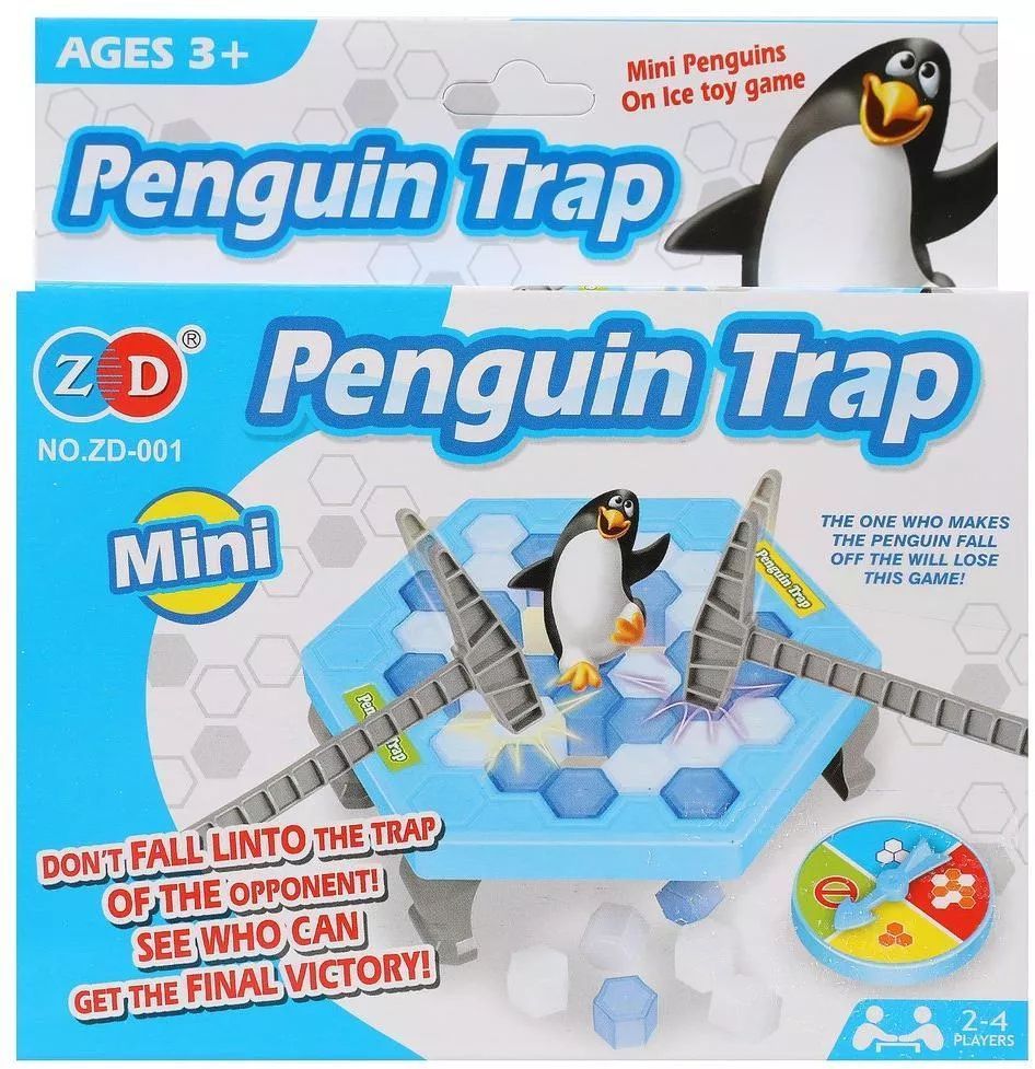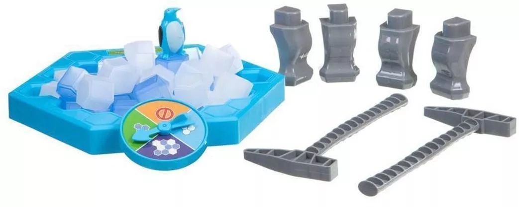 «Пингвин на льду» - увлекательная настольная игра, рассчитанная на развитие меткости и ловкости. До начала игры на основу нужно установить кубики-льдинки, затем поставить её на ножки и поставить фигурку пингвина посередине. Задания определяются значением стрелочки, выпавшим на рулетке, например, «Выбей 2 синих кубика» или «Выбей 1 белый кубик». Участникам предстоит очень аккуратно выполнять задания, используя специальный молоточек, и при этом не уронить фигурку пингвина.