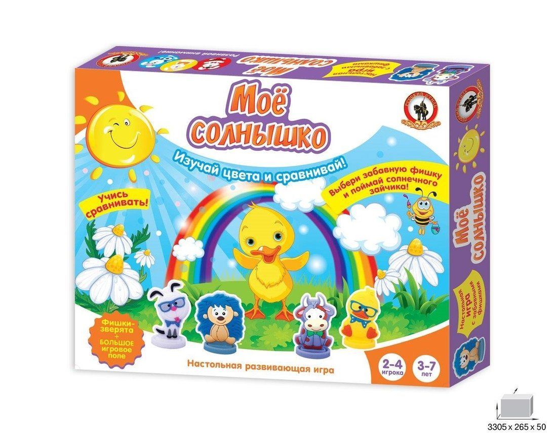 Как ярко светит солнышко и согревает всех своими лучами! Вместе с весёлыми фишками-зверюшками помоги разноцветным солнечным зайчикам вернуться домой на Солнышко! Эта весёлая развивающая игра научит малыша сравнивать предметы по цвету и размеру, познакомит с понятиями «больше», «меньше» и «равно». В комплекте вы найдете забавные 3Д фишки – фигурки. Играть такой фишкой очень удобно, весело и увлекательно. Фишки яркие, выполнены из красочного полимерного материала, высота фишки 3,5-4 см. В наборе цветные правила с подробным описанием игрового процесса. Состав: • игровое поле – 1 шт. • фишки-игрушки – 4 шт. • карточки – 24 шт. • правила игры