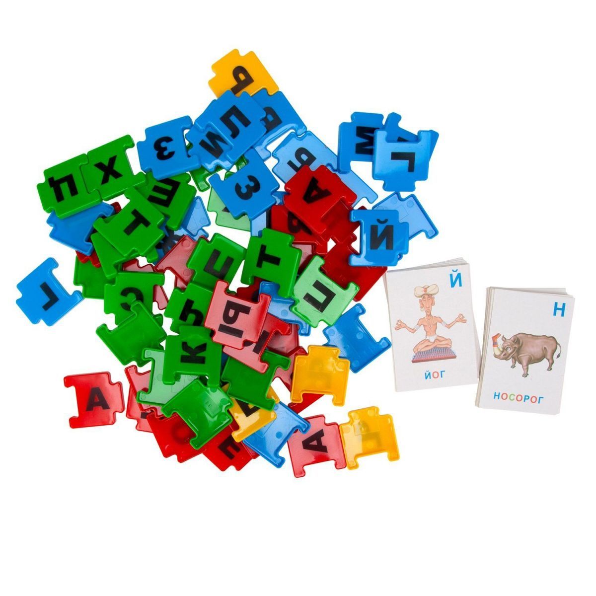 В наборе - элементы пазлов с изображением букв и карточки с буквами и словами.