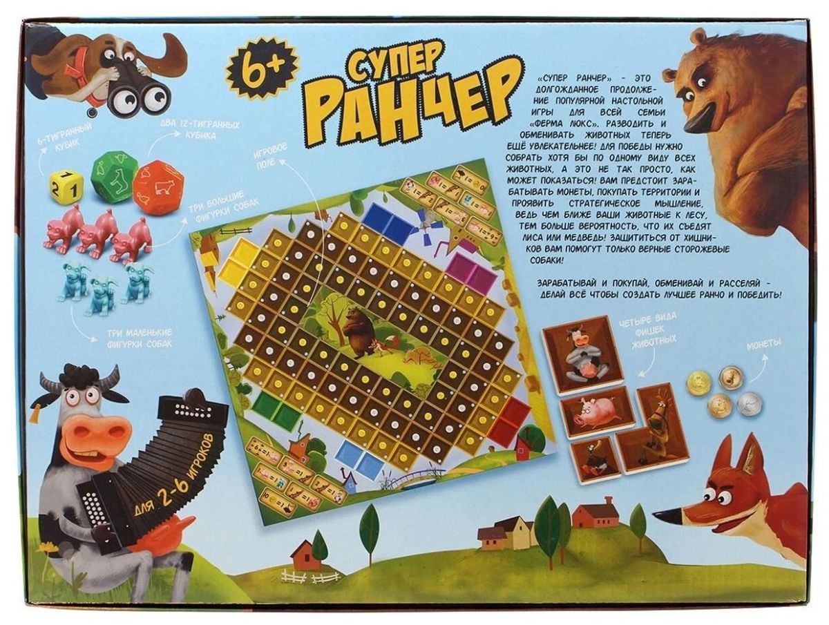 Супер Ранчер - игра для всей семьи, увлекательное продолжение настольной игры Ферма Люкс. Разводить и обменивать животных теперь ещё веселее и интереснее! Для победы нужно собрать хотя бы по одному виду всех животных. В комплекте: игровое поле, 4 вида фишек животных (утка, свинья, лошадь, корова), 3 маленькие фигурки собак, 3 большие фигурки собак, два 12-тигранных кубика, один 6-тигранный кубик, монеты.