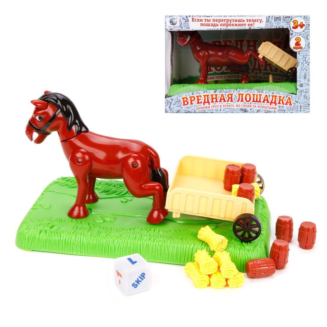 «Вредная лошадка» - увлекательная настольная игра, рассчитанная на 2-х участников. Правила игры: игроки поочерёдно кидают кубик и выполняют выпавшие указания. Участник, в чей ход лошадь опрокинет тележку, считается проигравшим.