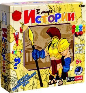 В мире Истории – игра для детей от 5 до 8 лет. В игре могут участвовать от 2 до 4 игроков. Игрокам кроме знаний необходима и удача. Цель игроков пройти как можно больше через синие и красные ходы с цифрами, ответить правильно на большее число вопросов и получить соответственно деньги и жетоны.