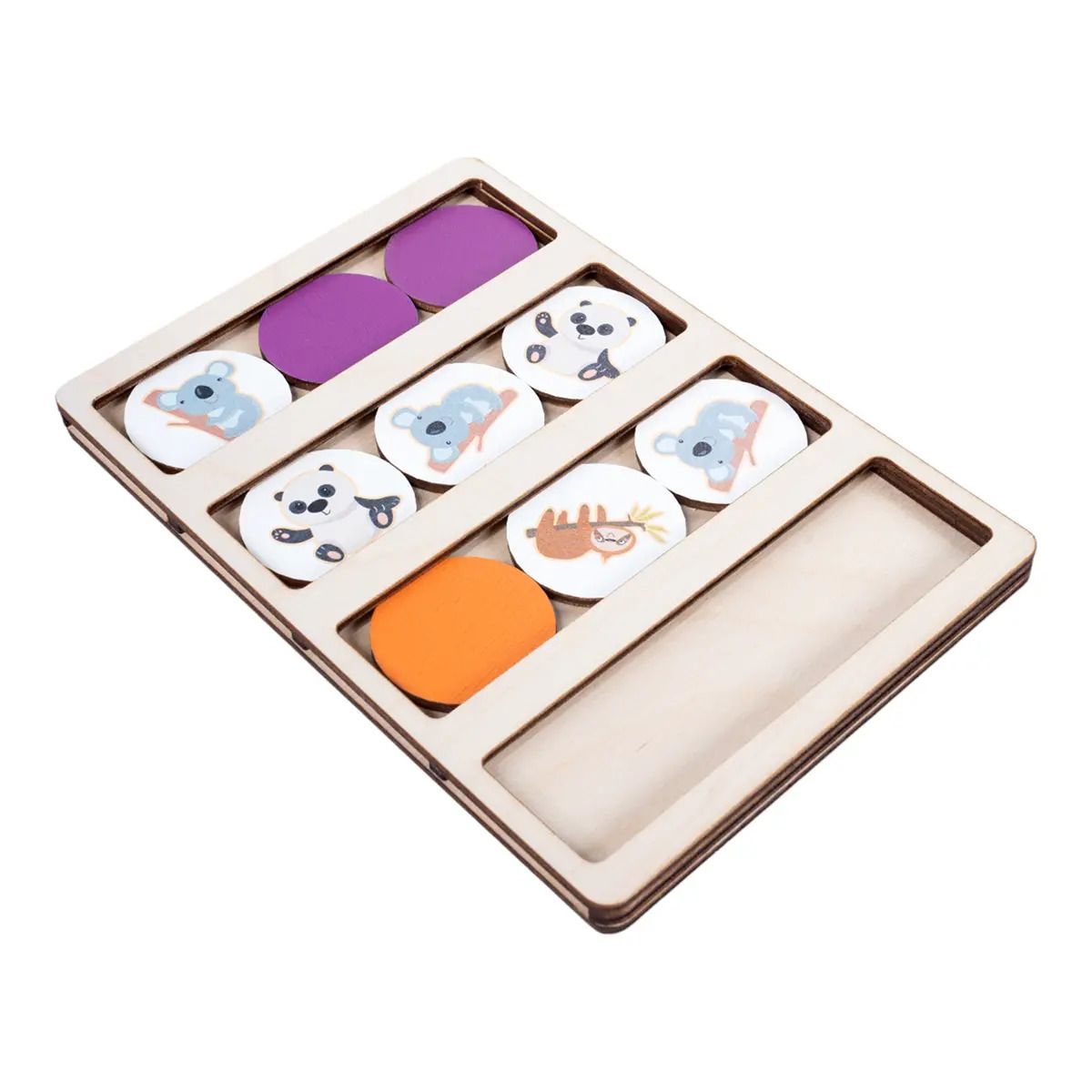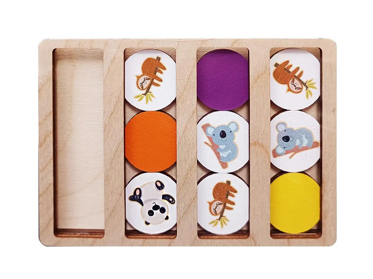 рамка с 4 отделениями-колбочками (13 х 19 см), двухсторонние цветные фишки - 9 шт. (диаметр 4 см). Материал: березовая фанера. Игрушка предназначена для детей старше 3 лет.