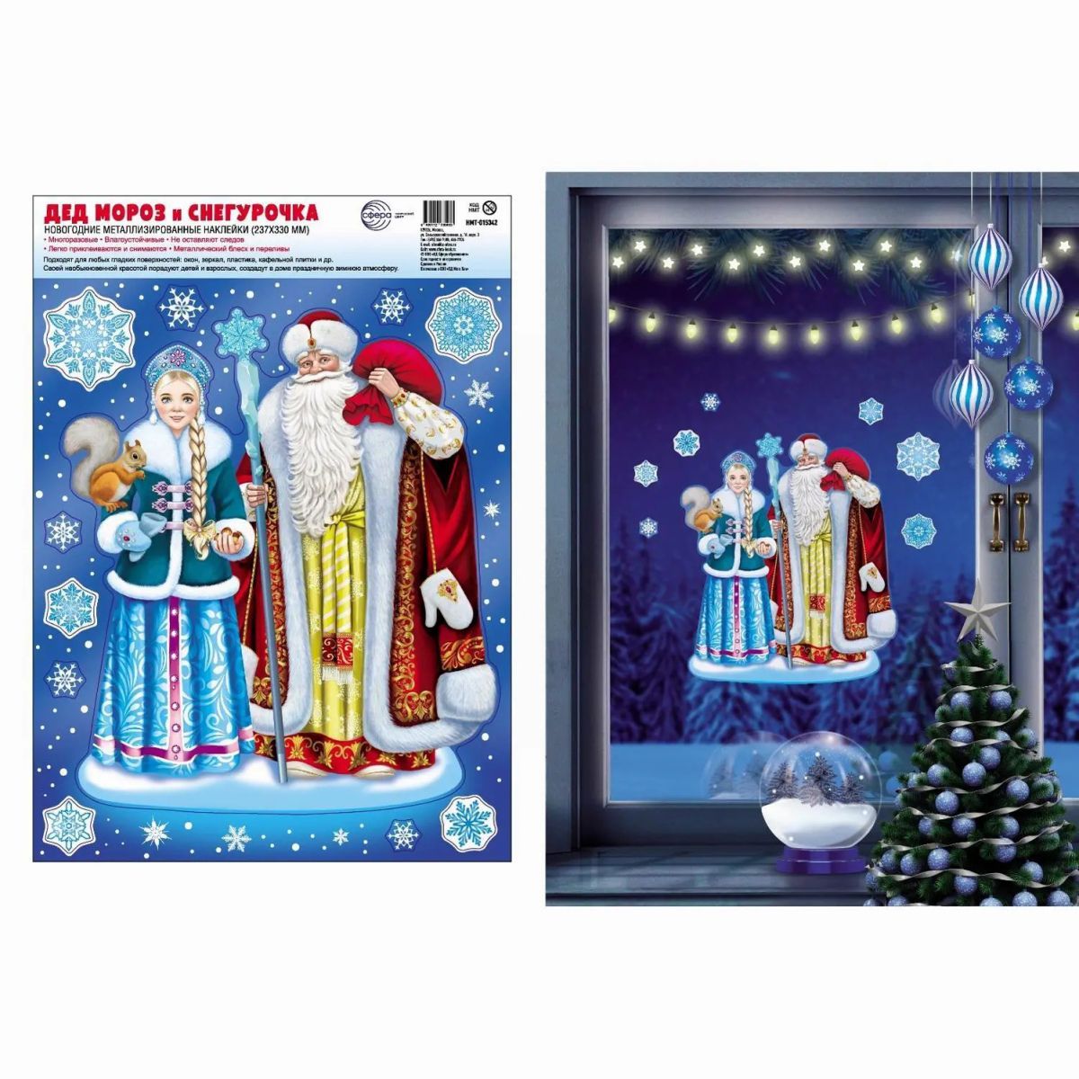 Наклейки новогодние Дед Мороз и Снегурочка (серебряная металлизация, многоразовые).