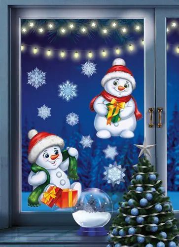 Наклейки новогодние на окна Снеговики, формат А3 (многоразовые, видны с обеих сторон).