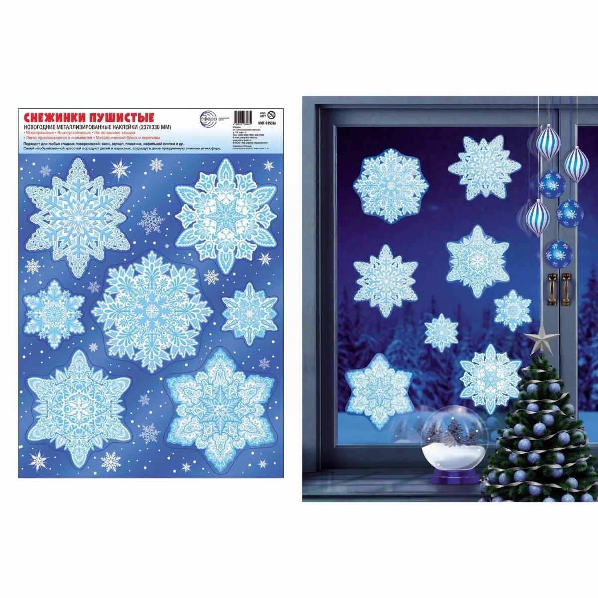 Наклейки новогодние Снежинки пушистые (серебряная металлизация, многоразовые).